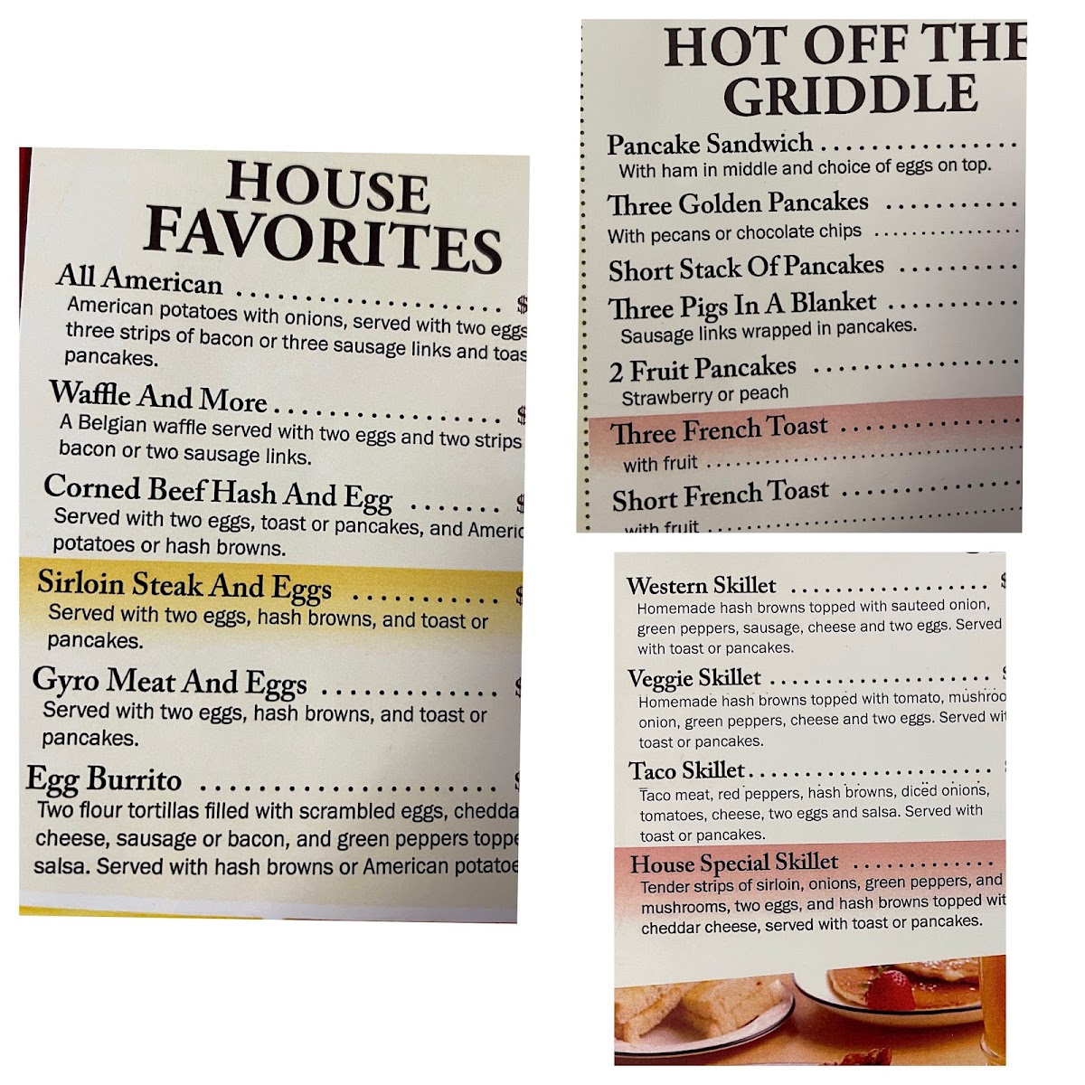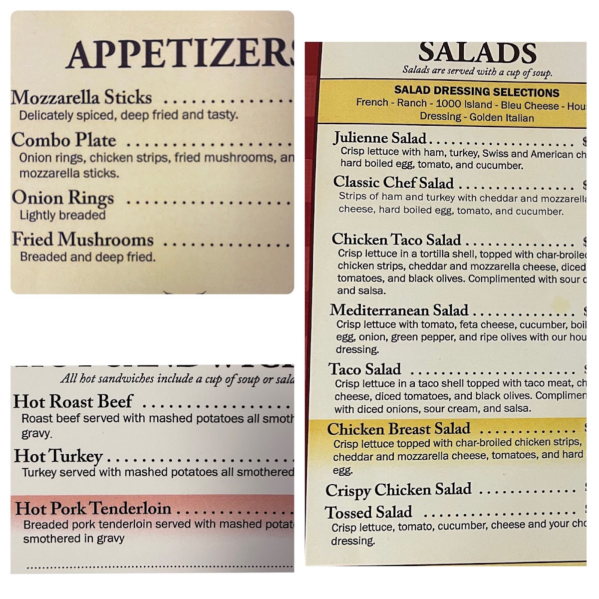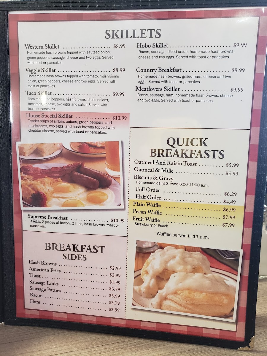 Guests will find simple plates focused on generous portions and homestyle flavors. Morning meals often feature lighter options like grilled chicken with fresh vegetables or a colorful fruit plate, perfect for starting the day on a wholesome note. For those seeking something a bit more filling, classic omelets and rich, savory hot sandwiches smothered in gravy offer a satisfying midday choice.